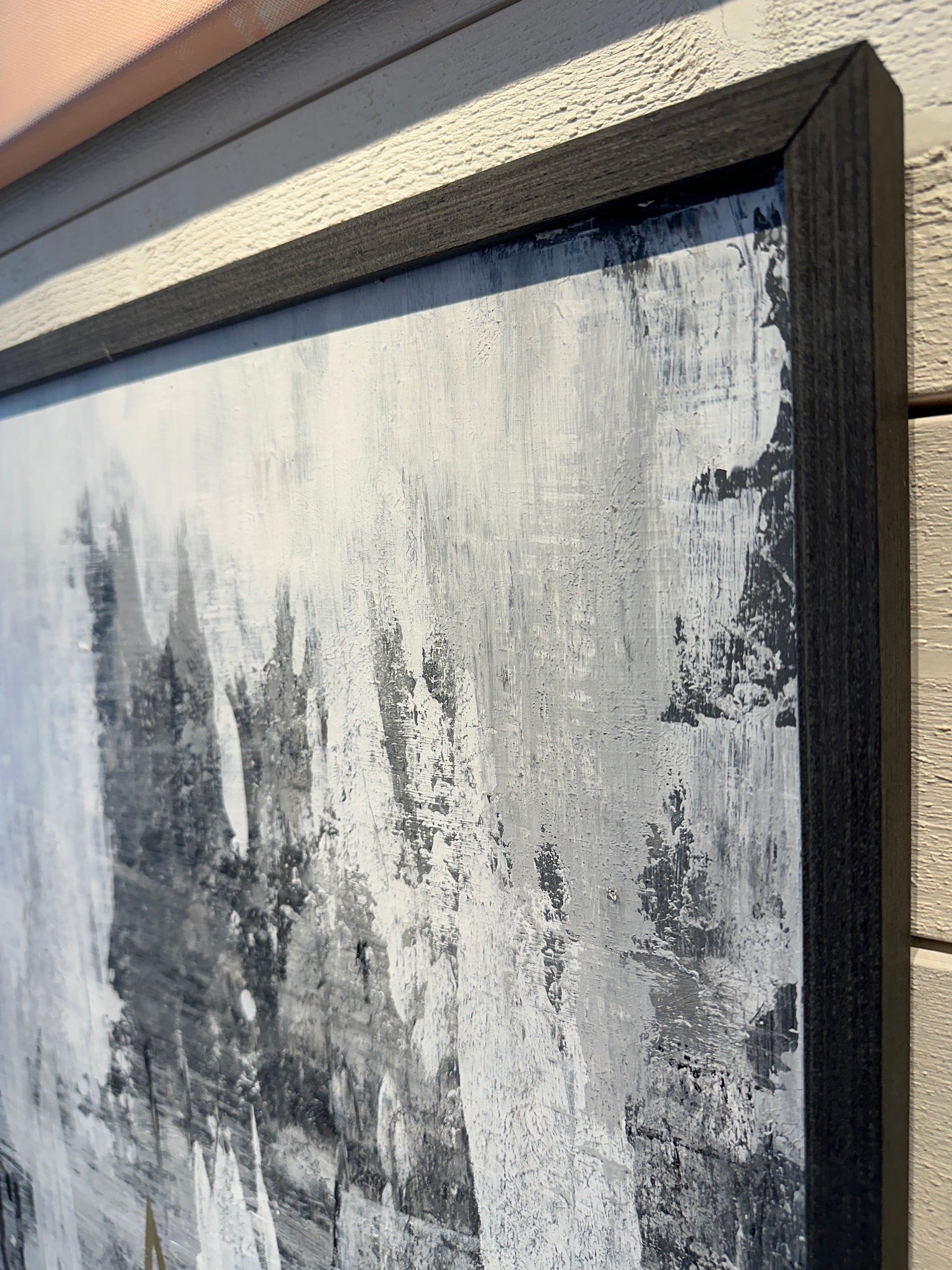 Målad med Akryl på tunn skiva. Monterad i en mörk träram och färdig att hängas på väggen som den är om du vill.