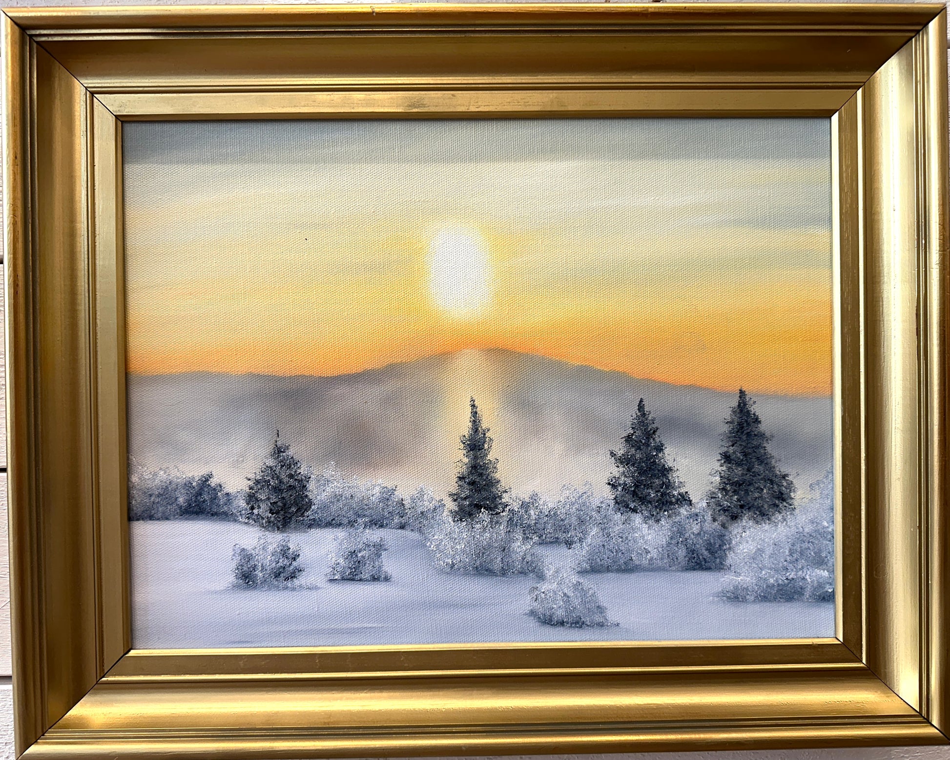 Jag fyndade ramen på loppis - spraymålade den i guld och målade ett ”Vinterljus”. Kallar det för ”recycling art GOLDEN edition”.